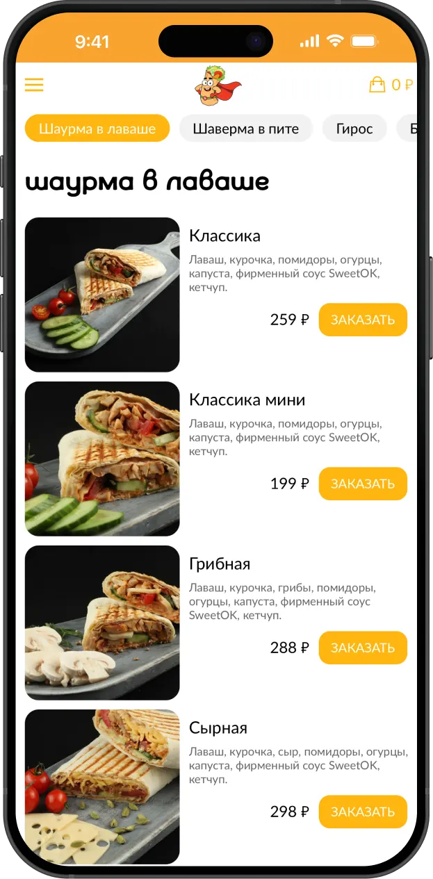 Лаваш, курочка, грибы, помидоры, огурцы, капуста, фирменный соус SweetOK, кетчуп.